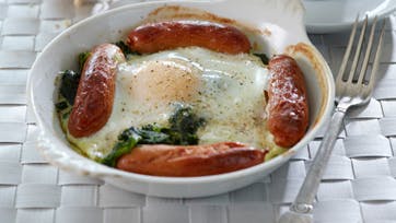 Tø spinaten op, tryk væden af og fordel den i 2 smurte, ildfaste tallerkner. Krydr med salt, peber og muskat. Hæld væden fra mozzarellaen og skær dem i mindre stykker, læg dem oven på spinaten. Fordel pølserne langs kanten. Sæt tallerknerne i ovnen ved 225° i 2-3 min. Slå et æg ud i hver tallerken og sæt tallerknerne tilbage i ovnen 5-6 min., til æggehviden er stivnet. Spis grovboller til.