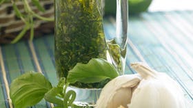 Hak timian, oregano og basilikum og kom dem i en flaske eller et glas med låg. Kom salvieblade, hvidløg i mindre stykker, salt og peber i en morter og knus det sammen til en pasta med lidt af olien. Hæld pastaen og resten af olien over de hakkede krydderurter og ryst godt. Lad olien trække i mindst et par timer før brug.
