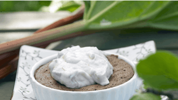 Smelt smør og chokolade over vandbad og lad det afkøle lidt. Pisk sukker og æggeblommer luftige og rør chokoladeblandingen i sammen med mandler, kaffe og mel. Pisk æggehviderne stive og vend dem i. Hæld dejen i 8 små smurte tærteforme og bag dem i ovnen ved 175° i 15 min. Skær rabarberne i 3 cm lange stykker og læg dem i et ildfast fad. Bland vaniljekorn med sukker og drys det over rabarberne. Stil fadet i ovnen ved 175° i 30 min., til rabarberne er møre. Hæld rabarbersaften i en skål og rør siruppen i. Pisk saften i den græske yoghurt og vend rabarberne i. Fordel cremen over chokoladetærterne og server med lidt citronmelisse.