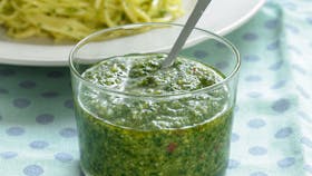 Pestoen her er lidt krydret, hvilket gør den velegnet både til pasta og som dressing i en sandwich
