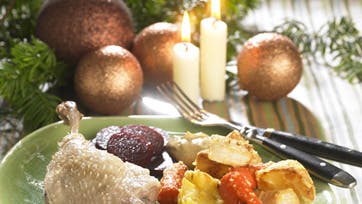 Kog vand, salt, sukker og peberkorn op og lad det afkøle. Hæld saltlagen over andelårene og stil dem på køl i 8 timer. Skyl andelårene og kog dem i vand tilsat løg, laurbærblade, peberkorn og timian i 50 min. Skræl rodfrugterne og skær dem i grove stykker. Fordel rodfrugterne på en bageplade med bagepapir, drys med salt og bag dem i ovnen ved 200° i 35 min. Rør peberroden ud i olien og vend de bagte rodfrugter heri. Server med sennep og syltede rødbeder.
