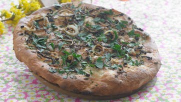 Smuldr gæren og rør den ud i vandet. Tilsæt salt og mel og ælt dejen godt, så den bliver blank og sej. Hæld dejen ud på et bord med bagepapir og lad den hæve 1 time. Skær løget i skiver og svits det mørt i 2 spsk. olie. Køl det lidt af.