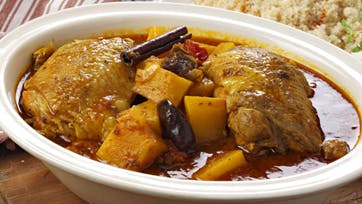 Blend ingredienser til kryddermassen. Brun kyllingestykkerne i en stor gryde. Tag dem op og kom kryddermassen i gryden med lidt vand. Tilsæt butternut i tern, så løg, suppe og kanel og kog igennem. Kom tomater ved og læg kyllingen over, så den dampes. Læg ikke låg på og lad det småsimre i 1 time. Kort før servering kommes dadlerne med og der drysses med koriander.