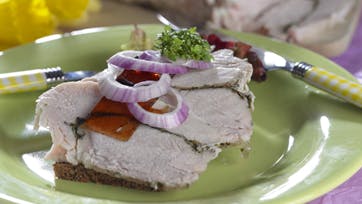 Skær kalkunbrystet næsten igennem og bred det ud, så det bliver dobbelt så stort og halvt så højt. Hak hvidløg, persille og timian og fordel det på kalkunbrystet sammen med salt og peber. Læg udblødt husblas over og rul brystet stramt sammen som en roulade. Skær et passende stykke fedtnet til og pak det omkring rouladen. Rør saltlagen sammen og lad rouladen trække heri i 2 døgn. Kog rullepølsen i kogelagen i 1½ time og lad den køle af under pres.