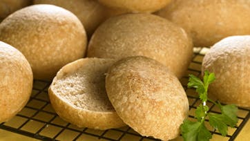Rør vand og gær sammen i en skål. Tilsæt olie, salt, sukker og de to slags mel, hold lidt hvedemel tilbage i begyndelsen. Bland ingredienserne og ælt dejen godt. Hæver tildækket 2-3 timer. Form dejen til 12-14 boller eller tril den i stænger og skær dem i brede snitter. Læg dem på plade og kom et fugtigt viskestykke eller en omvendt bradepande over. Stil det køligt til næste morgen. Stil pladen på køkkenbordet, mens ovnen varmes op. Tænd