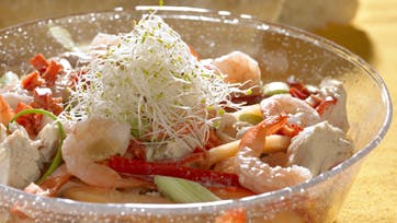 Kog fileterne 15 min. i vand med salt og lidt citronsaft. Køles af og skæres i strimler. Skær pebrerne i strimler. Skræl melonen og skær den i tynde både. Flæk chilien og skær den i små tern. Bland alt i en skål og vend det rundt med citronsaft, salt og peber. Varm kokosmælken og pisk chutney i. Hæld det over salaten. Server med godt brød eller flute.