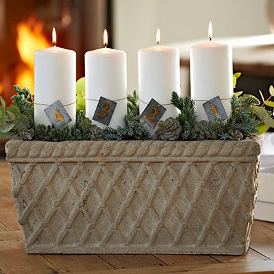 Den 18 cm lange betonkrukke med harlekinmønster til ca. 249 kr. fra B Green fores med to oasisblokke. Stik fire adventslys ned i blokkene og pynt hele vejen rundt i kanten med blød ene, eukalyptus og stængler af sukkulenter. Træk de små nummerkort i zink fra Ib Laursen (ca. 39 kr. for 4 stk.) ned over lysene.