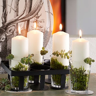 Fire ganske almindelige drikkeglas fores med mos, og fire bloklys sættes i hvert sit glas. Bind stængler af en lidt ranglet sukkulent rundt om lysene og stil dem samlet som i den sorte glasholder eller hver for sig, evt. på de små drinksbrikker. Glasholder i sortlakeret metal ca. 135 kr. fra Ib Laursen, drinksbrikker ca. 139 kr. for 4 stk. og finérbakke med kronhjort ca. 269 kr. (38 cm Ø) fra Koustrup & Co.