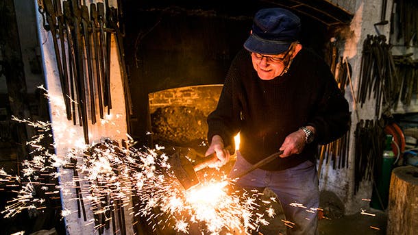 Sigurd Jensen har tændt essen op og trækker nu ved hjælp af en lang, grov tang et stykke rødglødende jern ud af flammerne og over på ambolten. Herefter løfter han en tung smedehammer op over skulderen og slår den af alle kræfter ned på det varme jern.