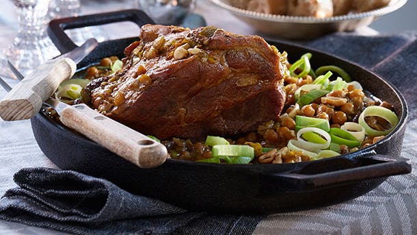 Denne nakkefilet har fået god tid i ovnen og smager vidunderligt sammen med kikærter og hjemmebagt brød.