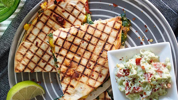 Fordel fyldet mellem tortillaerne, pensl med olie og steg dem på en grillpande ved jævn varme 4-5 min på hver side.