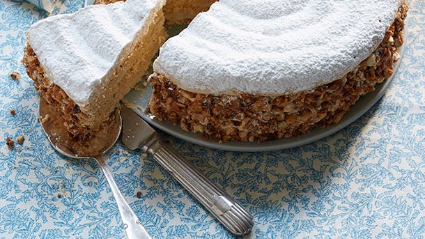 Hak de sidste karamelliserede mandler groft og tryk dem på kanten af kagen hele vejen rundt.
