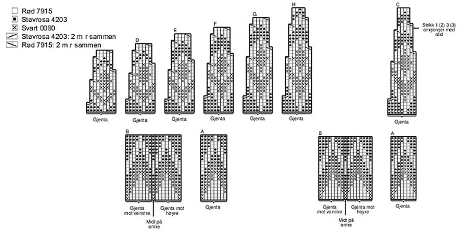 Skift til p 7 mm, og strik mønster efter diagram A. Videre strikkes glatstrik med støvrosa, til arbejdet måler 23 (26) 29 (31) 33 (36) cm. Strik 1 omgang mere, og luk 6 m af i hver side til ærmegab = 30 (34) 38 (42) 46 (50) m for- og bagstykket. Læg arbejdet til side, og strik ærmerne.