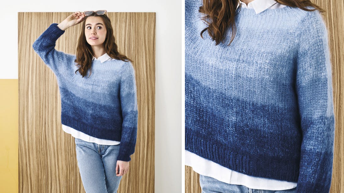 Den smukke dip dye-effekt skabes ved at skifte garnet en tråd ad gangen. Her får du opskriften på den fine striktrøje i det blødeste garn af silke og mohair.