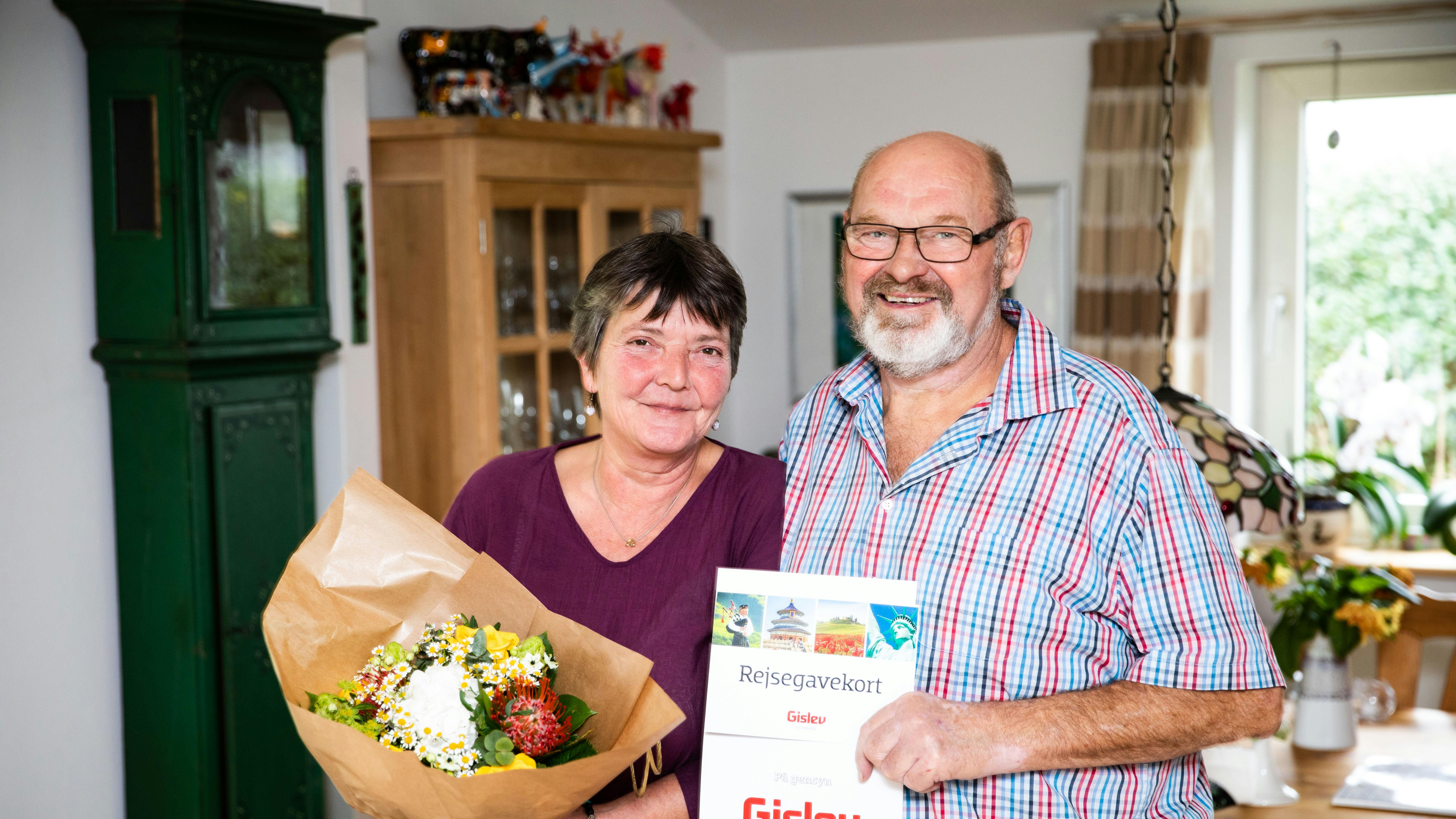 Præmien er et gavekort på 15.000 kroner til Gislev Rejser, og det bliver ægteparrets allerførste rejse sammen. For selv om hverken Sonja eller Benny mener, de har held i konkurrencer, må de indrømme, at dét har de i kærlighed.