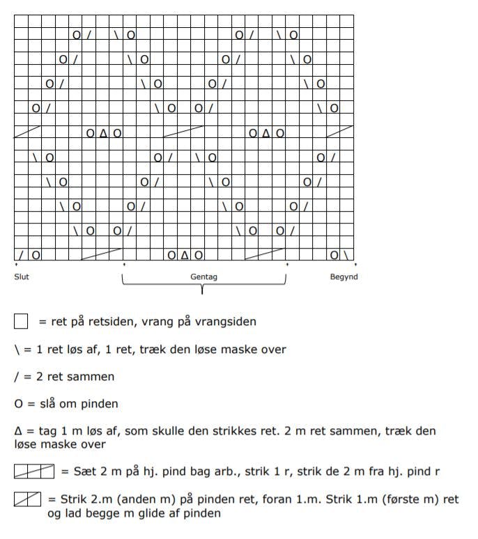 Fortsæt med at strikke efter diagrammet inden for 8 m i hver side, som hele tiden strikkes r og er kantmasker.