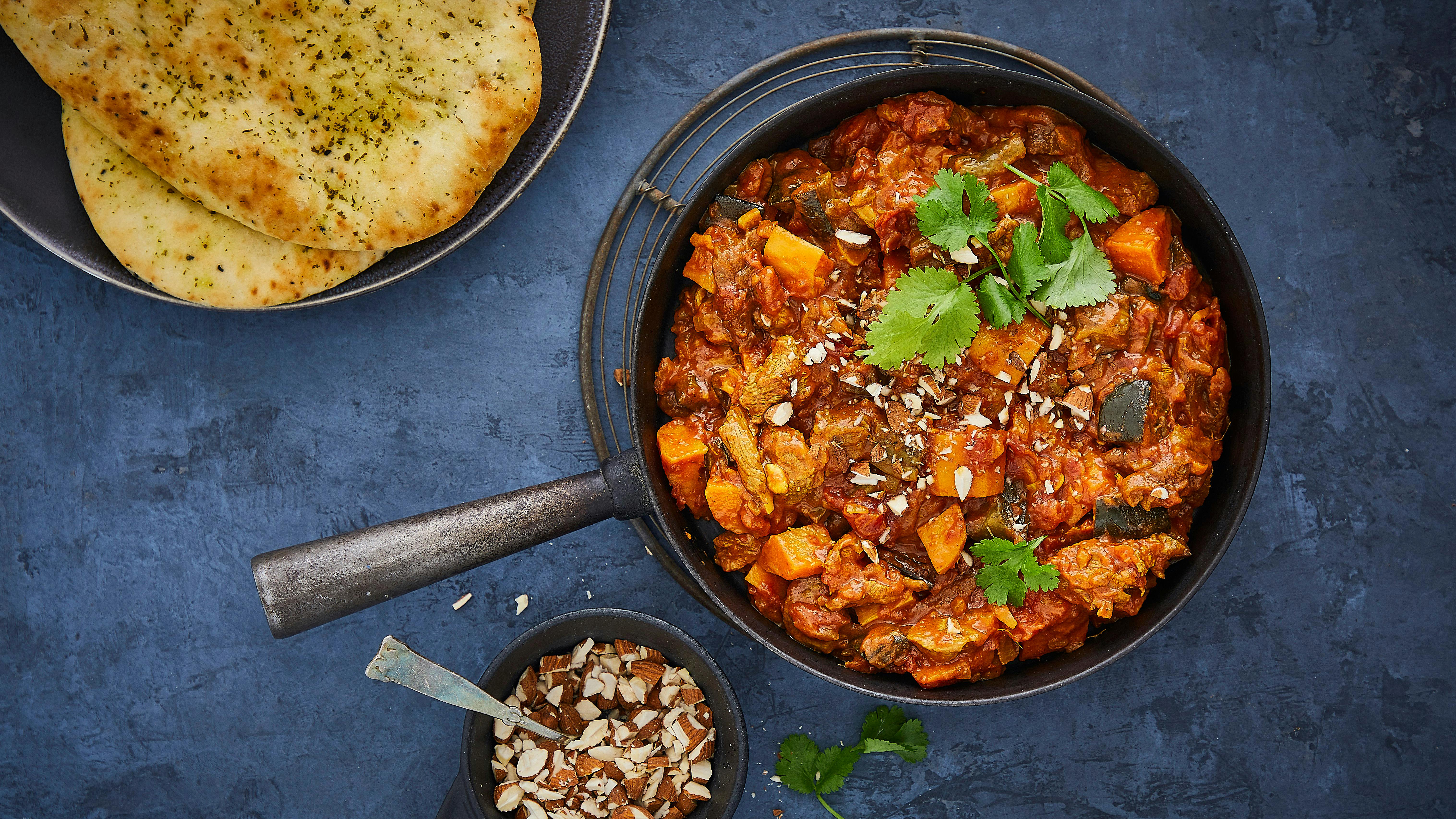 Smag til med salt, peber og evt. lidt sukker. Servér retten med koriander og grofthakkede mandler, og byd lunede naanbrød til.