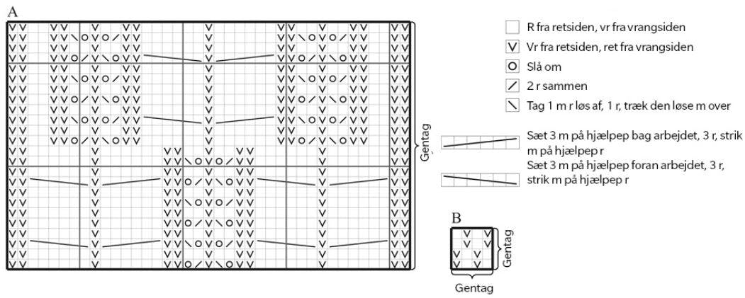 Fortsæt således: Sæt et mærke i begyndelsen af omgangen, 1 r, 24 (26) 29 (31) 33 m mønster efter diagram B, mønster efter diagram A (= 39 m), 24 (26) 29 (31) 33 m mønster efter diagram B, 1 r.