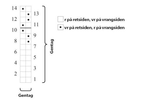 Strik 11 p r (1. p er arbejdets vrangside). Resten af arbejdet strikkes i striber efter diagrammet.