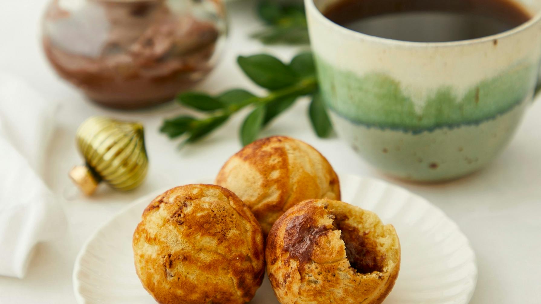 Læg en skefuld creme midt i hver æbleskive. Vend dem en halv omgang, når kanten har sat sig lidt, fyld lidt mere dej over, og bag æbleskiverne færdige på alle siderne.