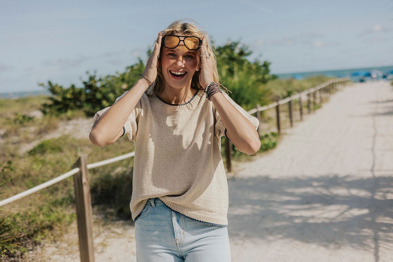 Info: T-shirten strikkes oppefra og ned. Først strikkes bagstykket ned til under ærmerne. Der strikkes vendepinde for at forme de skrå skuldre, og der tages masker ud i siderne til ærmegab.