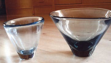 Begge skåle er designet og signeret af glasformgiveren Per Lütken (1916- 98). Han var ansat på Holmegaard Glasværk fra 1942 og helt frem til sin død. Han har indridset i bunden, at de er fremstillet i henholdsvis 1957 og 1961, og en vurdering for begge skåle ligger på ca. 800 kr.