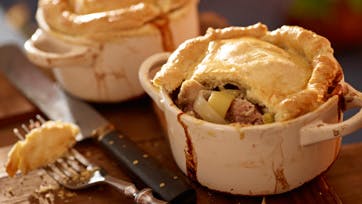 Kom mel, salt og smør i en foodprocessor og blend til smulder, saml dejen med et æg. Lad dejen hvile koldt i 30 min. Skær kyllingen i mindre stykker, lad skind og ben sidde. Læg kyllingestykkerne i en stor, ildfast gryde eller skål med låg, hæld æblemost, løgbåde, halvdelen af timianen, hele peberkorn og salt ved og fyld op med vand, så det dækker. Stil i ovnen ved 200° i 50 min. Pil kødet af benene og si suppen. Kom suppen i en gryde og reducer den, koge den ind, til ca. 1 l. Steg løgskiver og porrer i smørret og drys med mel. Kom resten af timian og citronskal ved og spæd med suppen. Kom kød og pølse i suppen, når den er kogt tyk. Smag til med estragon og piskefløde og kom suppen i små, ildfaste skåle. Rul dejen ud og udstik et låg til hver skål, læg dejen på skålene og pensl med æg, så de limes fast til kanten. Sættes i ovnen i 25 min. ved 210°.