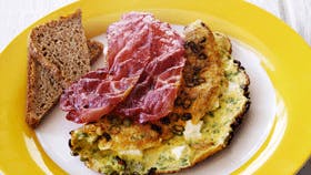 Sprødsteg skinken i olien ved høj varme på en lille sliplet-pande og læg dem på et stykke køkkenrulle. Skær forårsløget i ringe og sautér dem let. Pisk æggene sammen med salt, peber og persille og hæld dem over forårsløgene. Smuldr fetaen over æggemassen og lad den bage ved jævn varme i 5 min. til den har sat sig. Fold omeletten sammen og server med skinken.