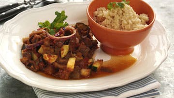 Steg alle krydderier, løg, chili, hvidløg og dadler i lidt af olien. Kom så auberginer og senere courgetter ved og kog af med tomater. Når det har simret i 25 min. tilsættes kastanjerne. Damp couscous og vend med hakket løg og krydderurter. Smag til med salt, peber og citron og server med grønsagerne.
