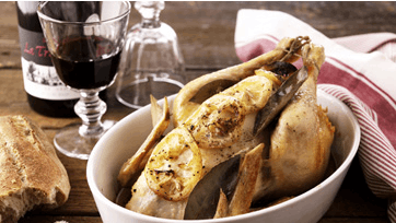 Brun kyllingen i en gryde på alle sider i olie. Tag den op. Hak løg, gulerod og selleri og steg i 5 min. Kom citronskal, timian og fennikelfrø i og sluk. Bland med kogte ris og smag til med salt og peber. Fyld det i den brunede kylling og luk med kødsnor eller -nåle, så det ikke triller ud. Læg skiver af citron og laurbær på kyllingen og kom den tilbage i gryden. Hæld vin ved og lad den simre i 60 min. under låg. Tag den op og stil under grillen i ovnen i 10 min. til sidst, så skindet bliver sprødt. Server med stegt broccoli og rucola eller lign. grønt.