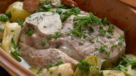 Skræl kartoflerne og lad dem være hele. Flæk peberfrugten og fjern kernerne. Skær toppen af hvidløget. Rens porrerne og skær dem i grove stykker. Læg et lag kartofler, porrer og pølse i bunden af stegesoen og krydr med salt og peber. Læg kødet ned med salt og peber og så resten af grønsagerne. Hæld æblemost ved. Sæt stegesoen i ovnen ved 200° 3 timer, til kødet er mørt. Skær boven i skiver og spis dem med porrer, kartofler og den kraftige sky.