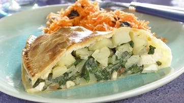 Vask spinaten og lad den dryppe godt af. Sauter spinat, skalotteløg og hvidløg let i olien og tilsæt muskatnød, basilikum, salt og peber. Skær feta og kartofler i tern og vend dem i spinaten sammen med mandlerne. Læg tærtedejen på et stykke bagepapir og fordel spinatblandingen på halvdelen af dejen. Fold den anden halvdel over og tryk kanten godt sammen. Pensl med æg og bag piroggen ved 180° i 25 min. Server med en god råkost.