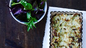 Bag tærten i ovnen i ca. 35 min. Skyl salaten og vend den sammen med æblecidereddike og olie.