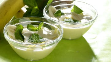 Pisk æggeblommer med æg og sukker og vanilje. Kom den tomme vaniljestang i mælk og fløde, der varmes til kogepunktet i en gryde. Hæld den varme mælk i æggesnapsen og varm, til det tykner. Må ikke koge, men må gerne komme op på 80°, især hvis du bruger friske æg, for så dør bakterierne. Afkøl og hæld i skåle til 6 pers. Lav flager af mango og stil i cremen sammen med skrå skiver af banan. Pynt med mynte.