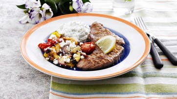 Skær auberginen ud i ½ cm tykke stave og drys dem med saltet. Skær peberfrugten i mindre stykker og halver tomaterne. Rør en marinade af olivenolie, citronsaft og hvidløgspeber og skyl auberginerne fri for salt. Vend auberginer, tomater og peberfrugter i marinaden, læg dem i en bradepande og bag grønsagerne ved 225° i 15 min. Vend snitslerne i mel blandet med salt og peber og steg dem ved middelhøj varme i 4 min. på hver side. Smuldr fetaen over de bagte grønsager og server snitslerne med en god tzatziki.