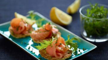 Bland majsmel, mel, majskerner, æg, mælk, smør, salt og peber og rør det til en glat dej. Bag dejen i smørret som små pandekager og lad dem køle helt af. Anret pandekagerne med salat, laksetern og klippet purløg og server.