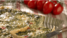 Saml dejen på en foodprocessor, rul den ud og læg den i en smurt tærteform. Forbag med en kant af alufolie ved 200° 10 min. Dræn spinaten for væde og rør æg, ricotta, spinat, løg, halverede tomater, salt og peber og ost sammen og kom i. Bag færdig ved 200° i 35-40 min. Serveres med salat.