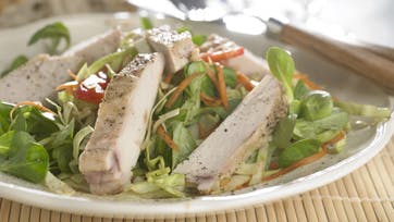 Skær kyllingen i strimler og blend den med alle de snittede og hakkede grønsager. Rør dressingen sammen og hæld den over. Lad den trække ca. 15 min. og server med groft brød.
