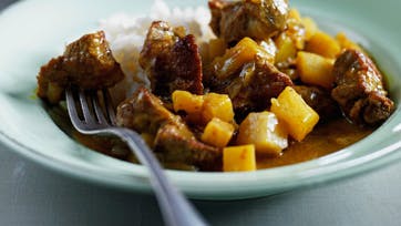 Skær kødet i tern og steg det i olie i ca. 5 min., til kødet er gyldent på alle sider, og hæld det i et fad. Hak løgene, kom dem i gryden med lidt ekstra olie og lad dem simre ved lav varme. Når de er halvmøre og klare tilsættes æbletern og selleritern. Steg det let i 5 min. under jævnlig omrøring, de sidste 2 min. med karry. Kom kokosmælken i gryden, tilsæt kødet og kog det igennem. Smag retten til, evt. med lidt hakket chili. Servér med friskkogte ris.