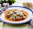 Beregn 1 lakseschnitzel uden ben til hver. Læg laksen på et bræt med skindsiden nedad og skær skindet fra. Skær schnitzlerne næsten igennem på langs og bred dem ud. Læg dem i et smurt, ildfast fad.