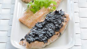 Miks med stavblender oliven, basilikum, olivenolie og hvidløg og smag til med salt og peber. Bred blandingen ud over laksen og sæt den i ovnen 10 min. ved 175°.