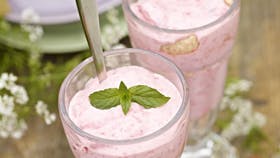 Skyl jordbærrene og skær halvdelen i mundrette stykker. Kom resten af jordbærrene i en foodprocesser sammen med mynteblade, kondenseret mælk, mascapone og græsk yoghurt og blend det til en jævn creme. Vend jordbærstykkerne i cremen og bræk makronerne i stykker. Kom makron og jordbærcreme lagvis i 4 portionsglas og pynt med mynte.