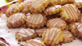 Kom mel, sukker og smør i en foodprocessor og blend kort. Rul dejen ud på kartoffelmel. Tryk ud med rillede forme og lav et lille hul i midten. Lægges på bagepapir og bages ved 180° i 10-12 min., til de er gyldne og sprøde. Rør lemoncurd med 1 tsk. kogende vand og kom det i flormelis. Smør på kagerne og lav striber af lyserød glasur eller gele bagefter. Drys evt. med sølv- og guldkrymmel.