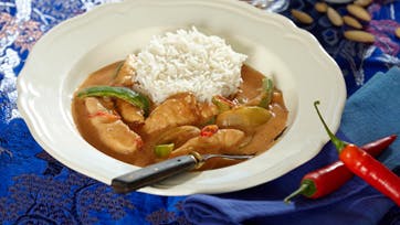Dup kyllingefiléterne tørre og skær dem i strimler. Pil løgene og skær dem i smalle både. Hak tomaterne og skær peberen i strimler. Brun kødet ved god varme i 2 spsk. olie og tag det op. Svits løg, tomater, peber og finthakket chili i 1 spsk. olie. Kom kødet tilbage i gryden og tilsæt soja, kokosmælk, chilisauce og tomatpuré. Lad det simre ca. 10 min. og smag til med salt og peber.