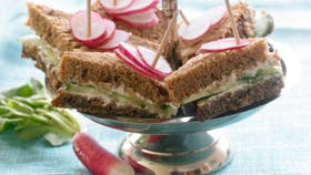 Rør flødeosten med dild, eddike, salt og peber og skær agurken i tynde skiver. Smør brødene med flødeosten, læg agurkeskiverne på rugbrødsskiverne og læg sandwichbrødene over. Skær hver sandwich i 4 trekanter og radiserne i kvarte. Sæt en tandstik med en kvart radise igennem hver sandwich og server.