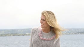 Materialer: "Kid-Silk" (75% kidmohair/25% silke/25 g = 200 meter): 125 (150) 175 g perlegrå nr. 09 + 25 (25) 25 g rosa nr. 04. Rundp nr. 6/80 cm. Rundp nr. 5/40 cm (til hals). Hæklenål nr. 4. (Garn fra Garnstudio, tlf. 80 01 81 71).