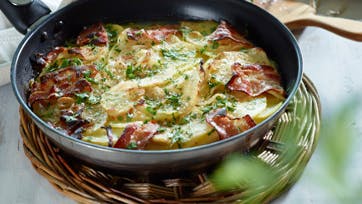 Skræl kartoflerne og skær dem i tynde skiver. Pil hvidløgene og skær dem i skiver. Læg kartofler og hvidløg i en skål og bland dem med mælk, 1½ tsk. salt, kværnet peber og muskat. Læg 6 skiver bacon i bunden af en stegepande og læg et lag kartofler med væde over. Dæk med bacon og resten af kartoflerne og pres det sammen. Læg smørklatter og alufolie over. Prik nogle huller i folien og kom folie om pandens håndtag. Sæt den i ovnen på midterrillen ved 180° 1-1¼ time, til kartoflerne er møre. Tag folien af og giv kartoflerne ca. 5 min. under grill.