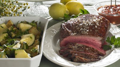 Gnid stegen med salt og peber og stil den i ovnen ved 200° i ca. 35 min. Tag den ud og tjek. Den skal være lidt for rå. Hæld kødsaften fra. Lad den afkøle og stil den så koldt. Ved hjemkomst sættes den 10-15 min. i ovnen ved 220° og hviler så til servering. Kom tomater i en gryde og kog op med peberkorn. Mos tomaterne ud med ske. Hæld cognac over og antænd ganske kort.