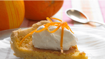 Bland mel, sukker, bagepulver og salt og hak smørret i. Saml dejen med æggeblommen og evt. lidt vand og rul den ud i 5 mm tykkelse. Beklæd en 24 cm tærteform med dejen og bag bunden i ovnen ved 200° i 12 min. Rør smør og sukker blødt og rør æggeblommerne i et ad gangen. Tilsæt revet skal og saft fra appelsinen og rør fløden i. Kom appelsinfyldet i tærtebunden og bag den i yderligere 20-30 min. Server tærten kold eller lun med flødeskum.