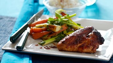 Rør sukker, soja, tomatpuré og eddike sammen. Knus stjerneanis og fennikelfrø let i en morter eller med bagsiden af en kniv mod skærebrættet. Rør det i marinaden og læg kyllingevingerne i. Stil det koldt nogle timer eller natten over. Læg dem i et ovnfast fad med marinaden ved og sæt dem i ovnen ved 180° i 45 min., til de er gennemstegte. Kog risene med vand og salt i 9 min. og lad dem hvile i 10 min. Skræl rodfrugterne og rens porrerne. Skær det hele i 5 cm lange stave og lynsteg dem i wok eller en dyb pande i 3-4 min. Drys med salt, peber og lidt knuste chili. Vend grønsagerne med hakkede krydderurter lige inden serveringen.